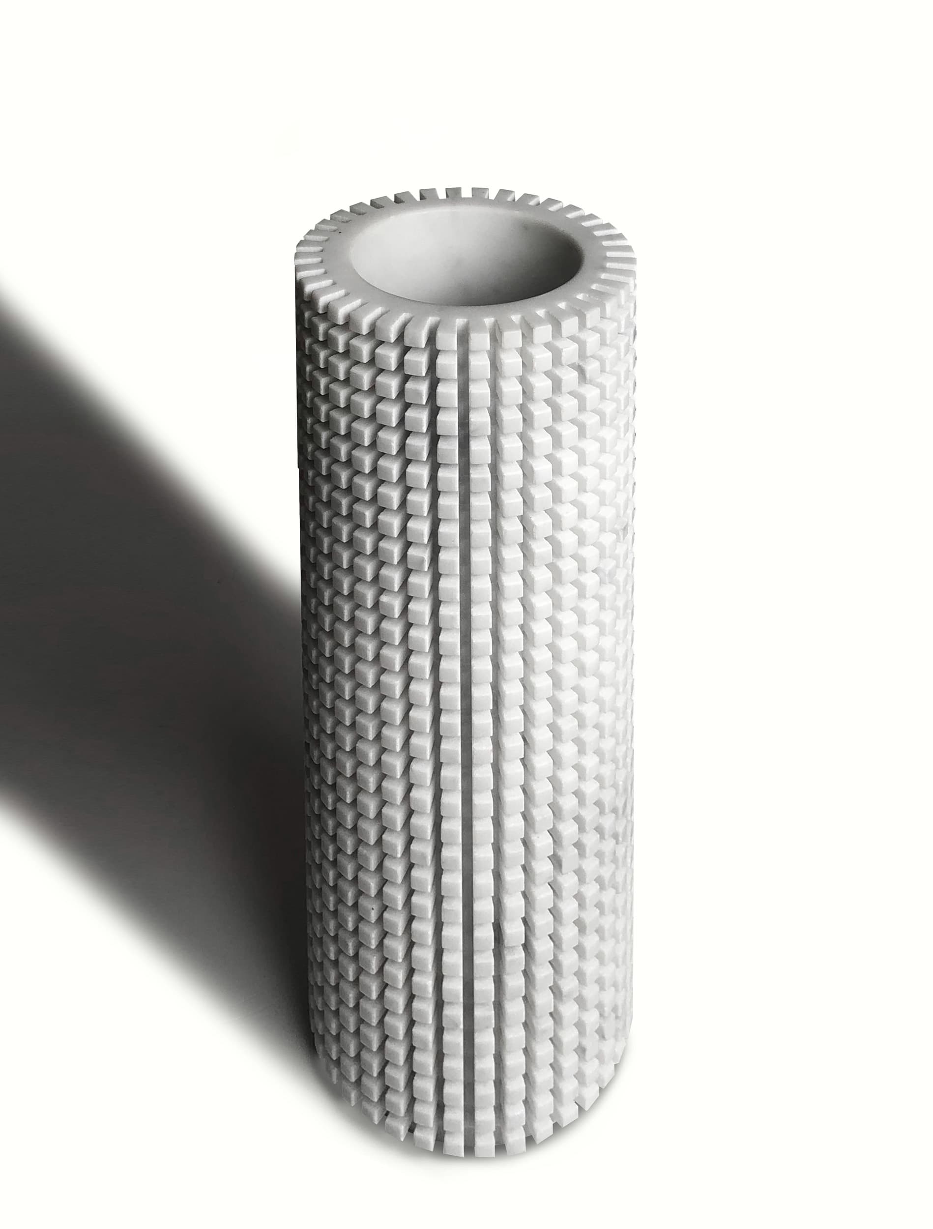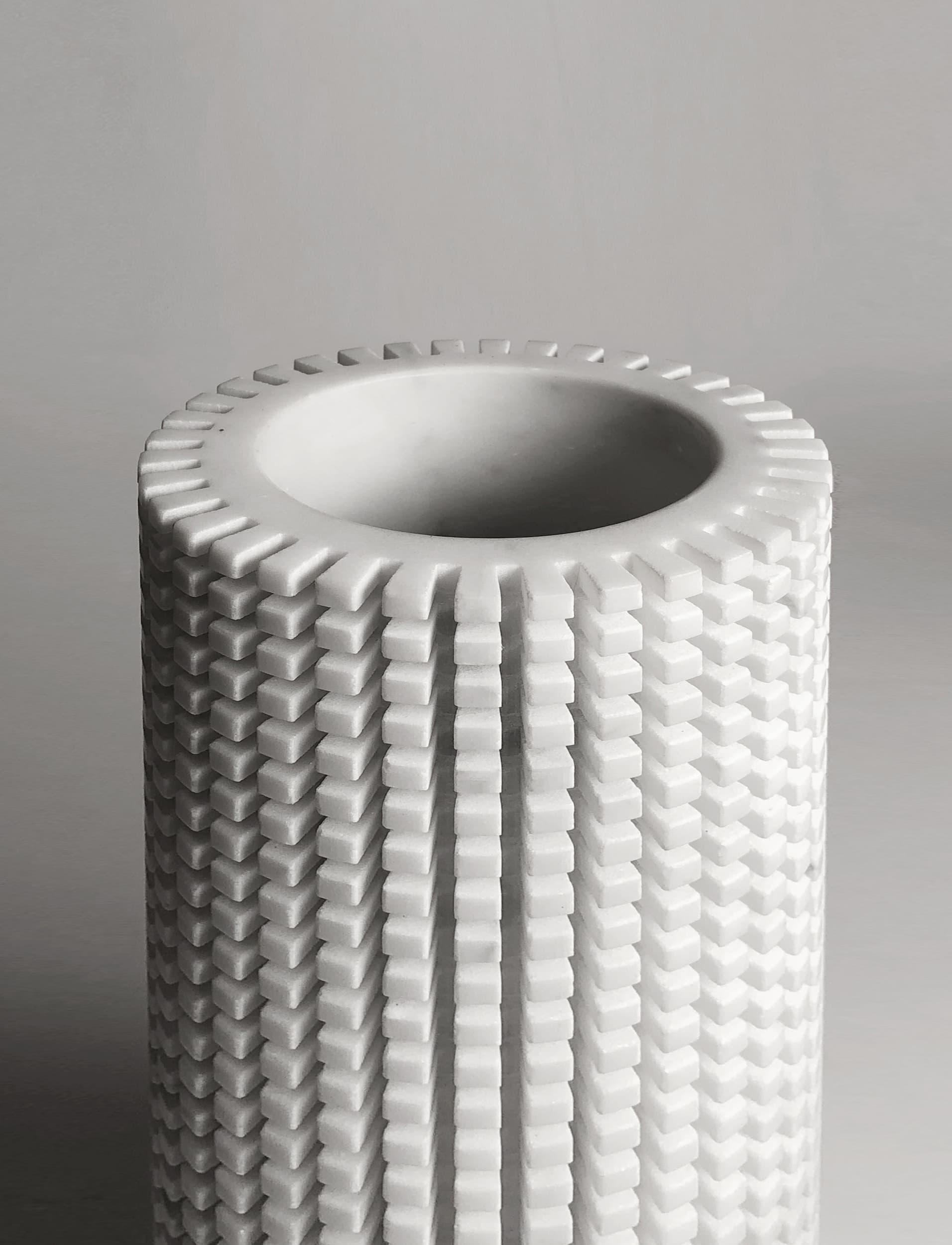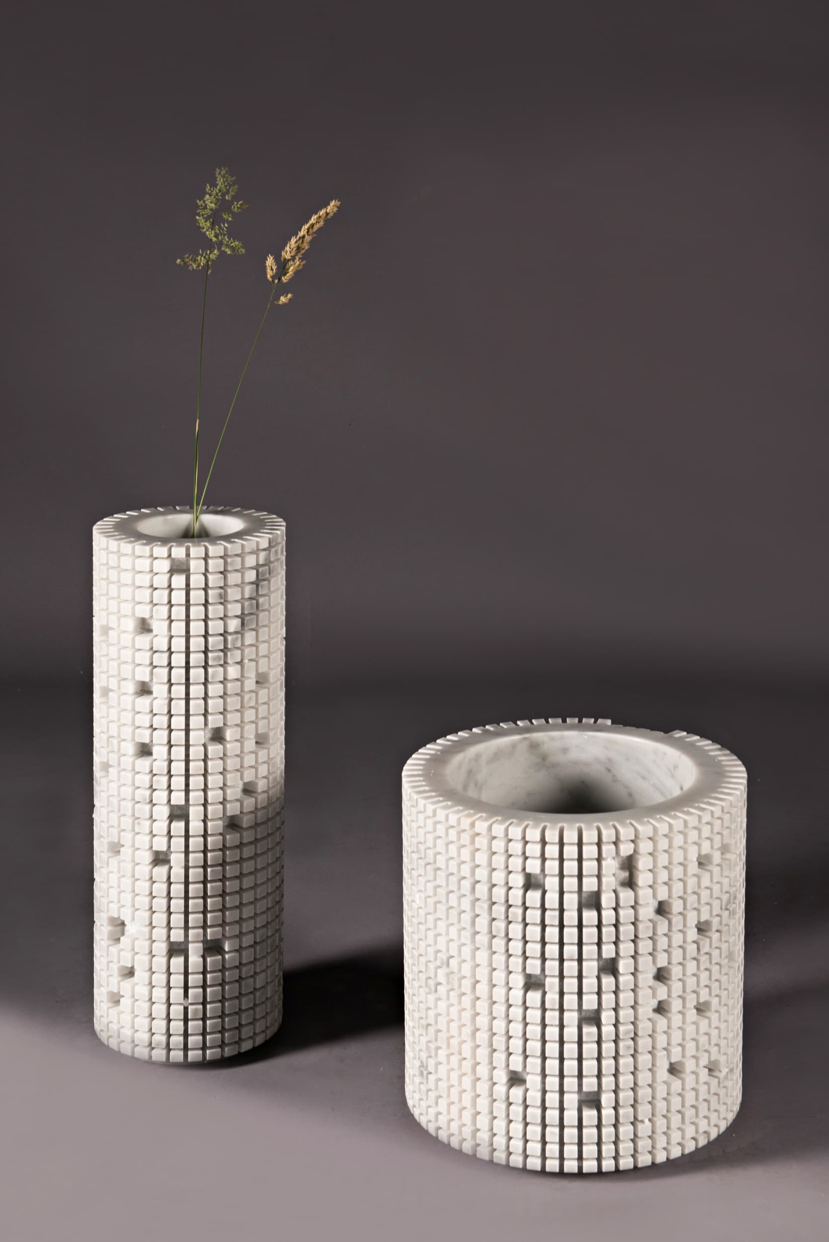La superficie di questi vasi è caratterizzata da tagli ortogonali che definiscono una griglia di pixel tridimensionali. All’occorrenza i pixel possono essere rimossi singolarmente, spezzandoli con un martello per dar vita a composizioni grafiche ogni volta diverse, create dal gioco di chiaro-scuro dei pixel rimossi